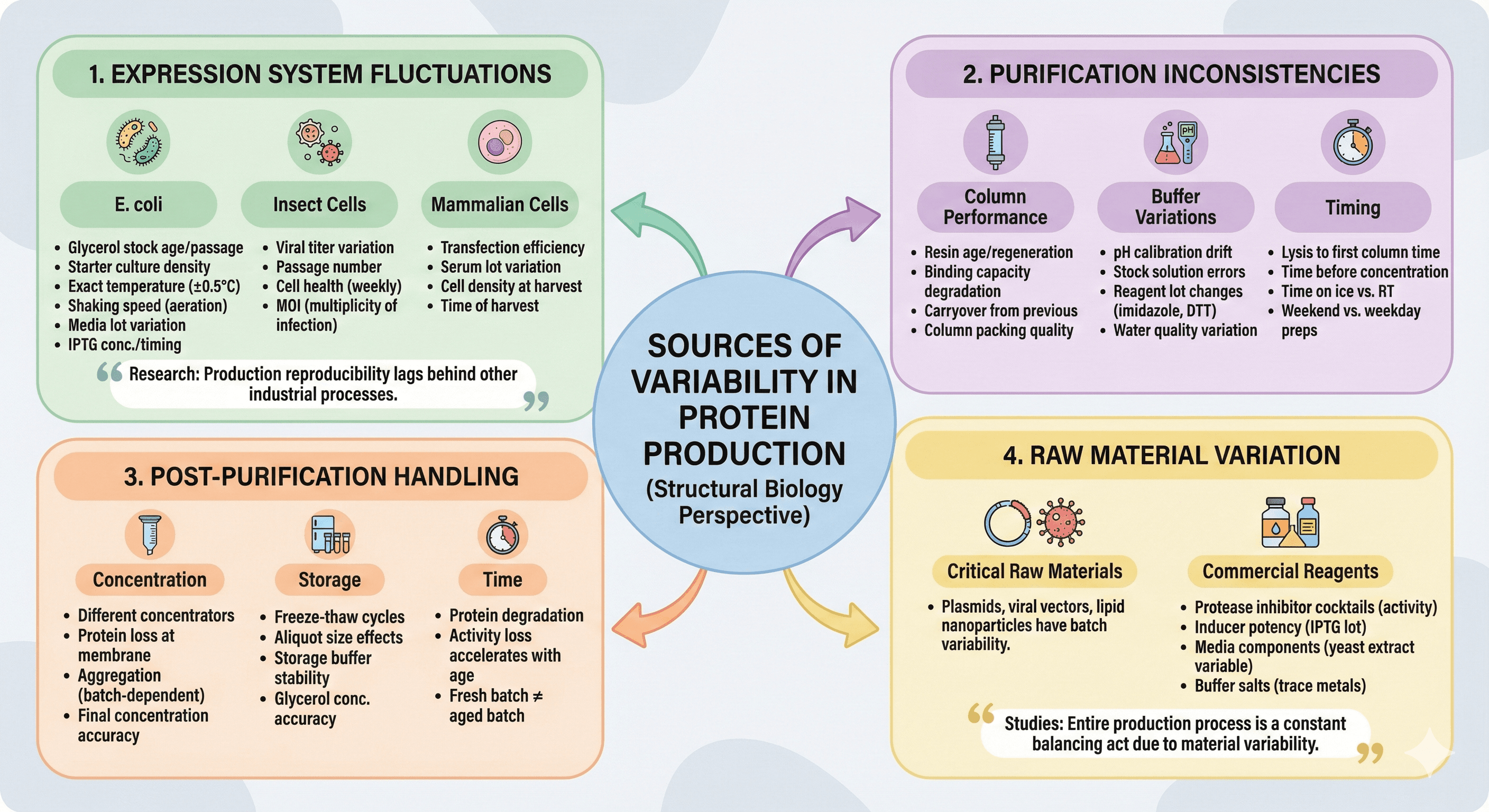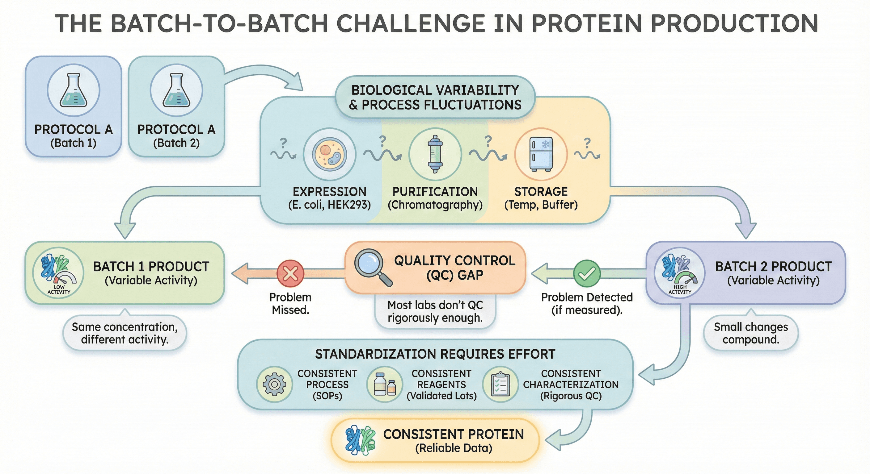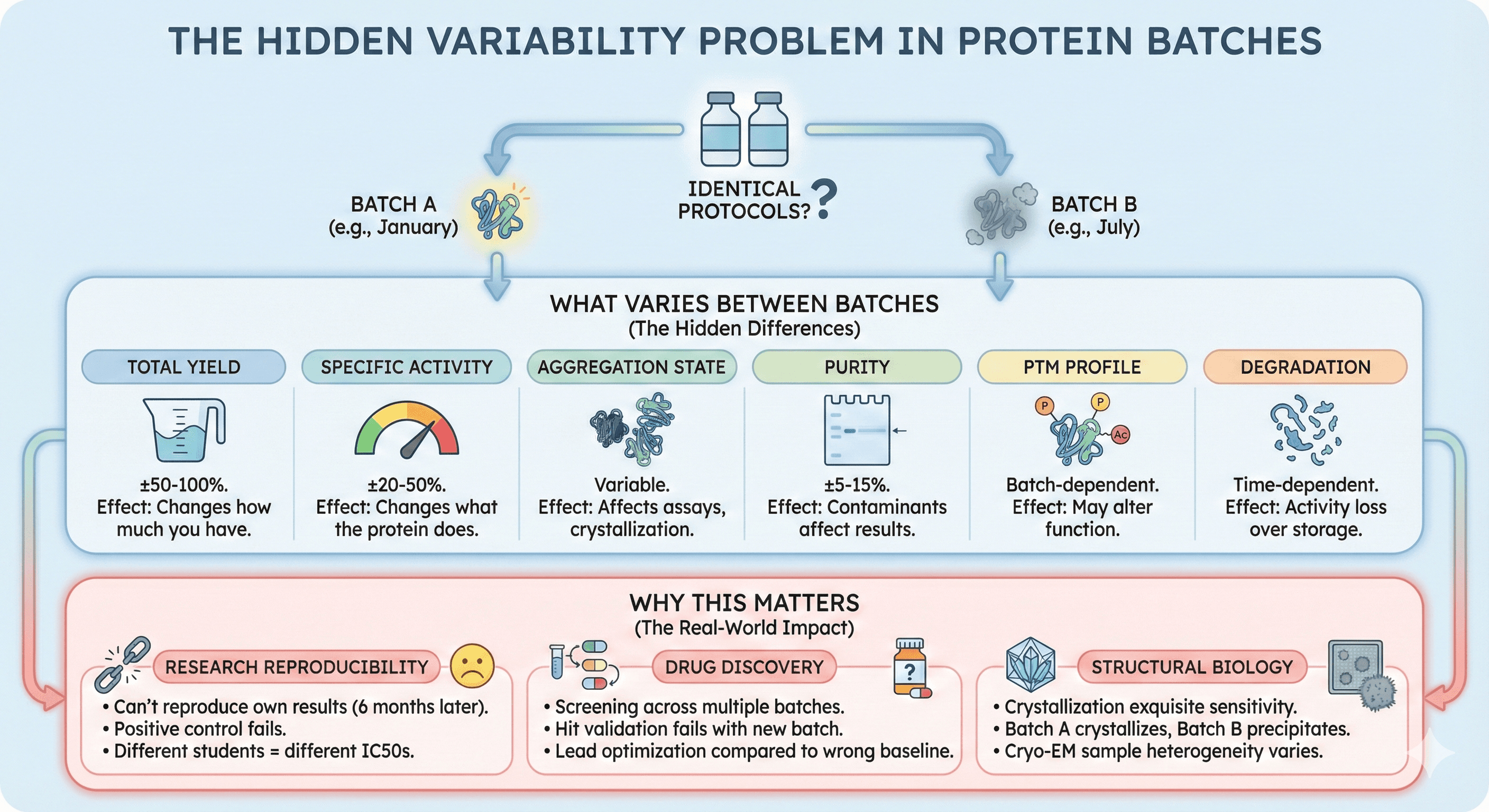 Last month's protein worked perfectly. Same construct, same protocol, same everything. This month's batch has half the activity, runs as multiple bands on the gel, and aggregates during concentration. You've changed nothing—but the results changed anyway.