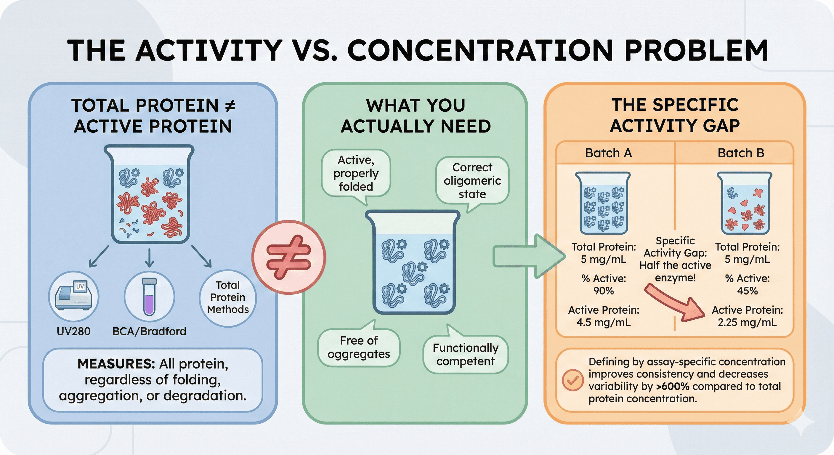 Research has demonstrated that "lot-to-lot differences in protein activity often still occur, leading to uncertainty in the accuracy of downstream measurements. These differences are postulated to be caused by a misrepresentation of the protein concentration as measured by traditional total protein techniques, which can include multiple types of inactive protein species."