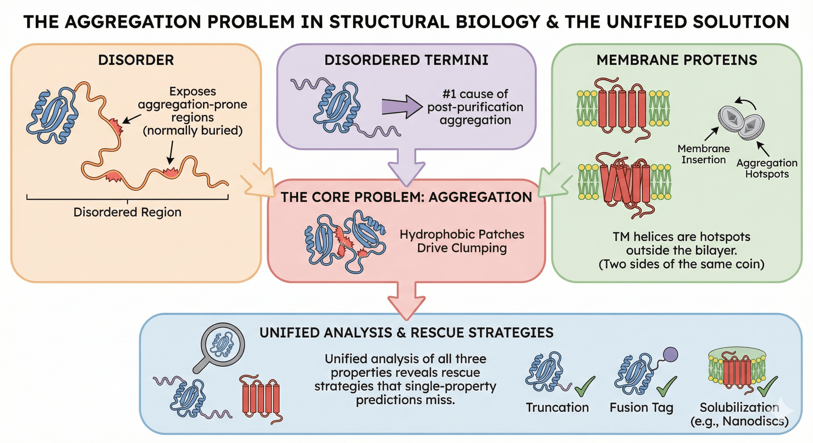 The frustrating part: this was predictable. The aggregation wasn't random. It was written into the sequence, hidden in the interplay between three properties that most researchers analyze separately but are fundamentally connected: disorder, aggregation propensity, and membrane topology.