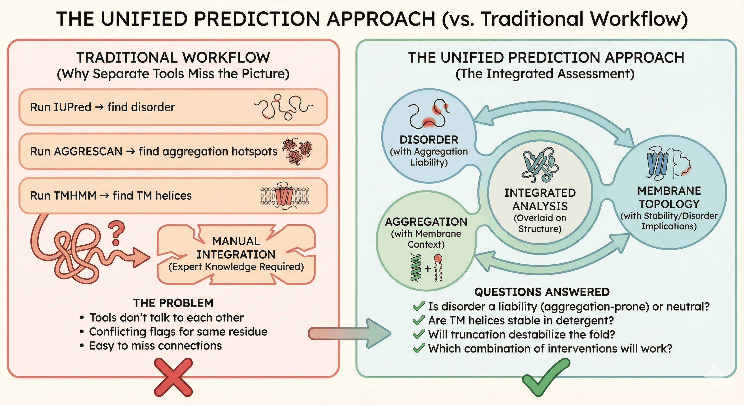 Most prediction tools treat disorder, aggregation, and membrane topology as separate problems: