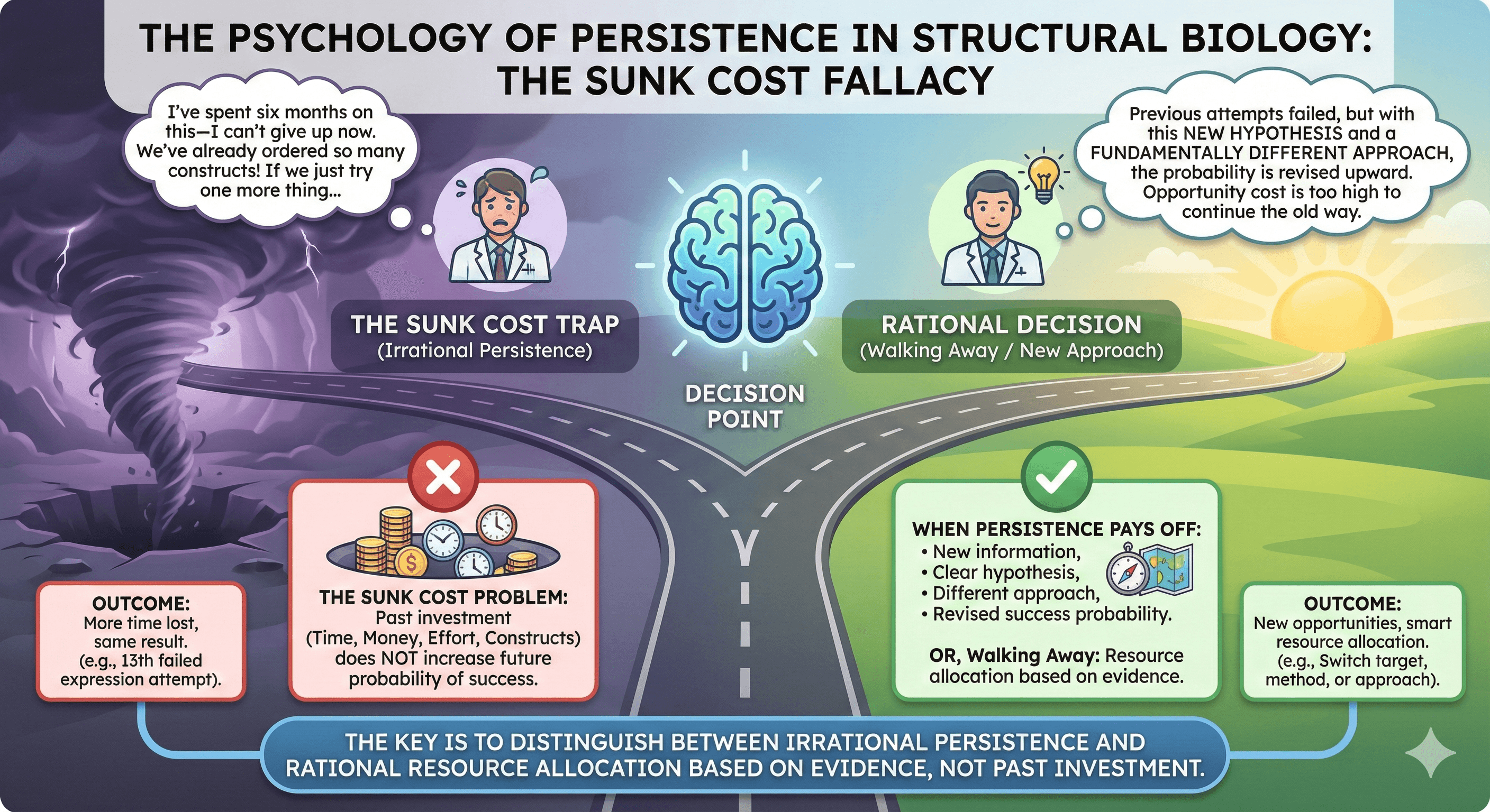 Target: "Important" transcription factor Investment: 2 years, 30+ constructs, 3 expression systems, collaboration with expert lab Best result: Low-quality crystals that never improved Decision: Continued because "so much invested"