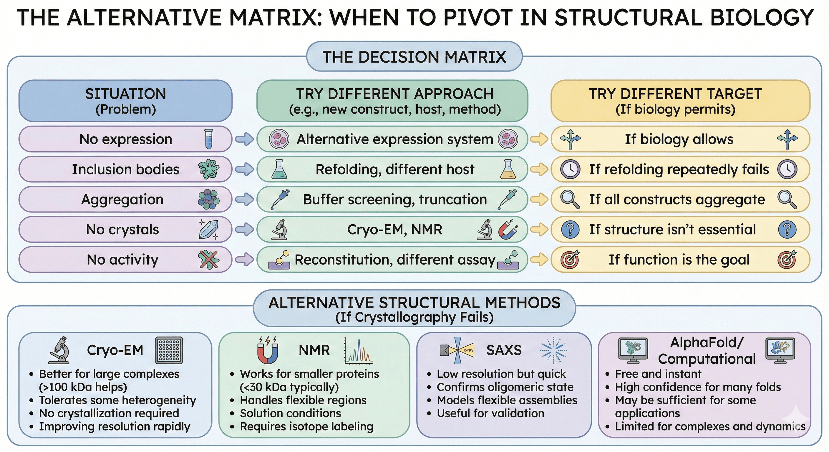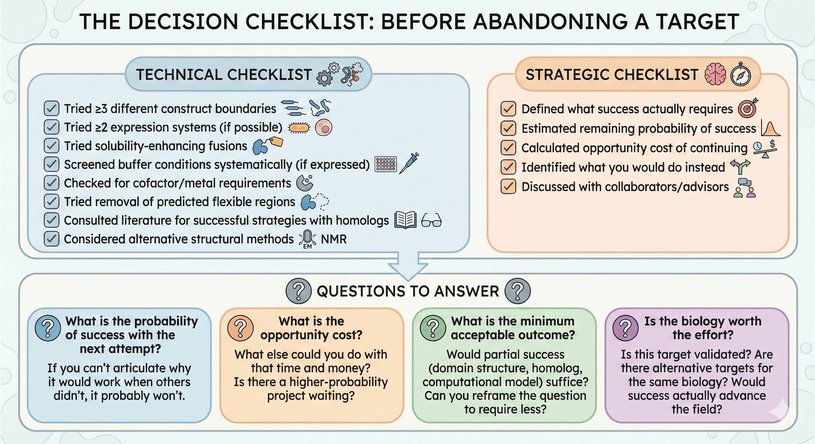 You've spent six months on this protein. Twelve expression constructs. Three expression systems. Refolding from inclusion bodies. Co-expression with chaperones. Insect cells. Mammalian cells. You have 200 µg of mostly aggregated material that loses activity overnight. Your PI asks if you should try one more thing. Your gut says to walk away. But how do you know when enough is enough?