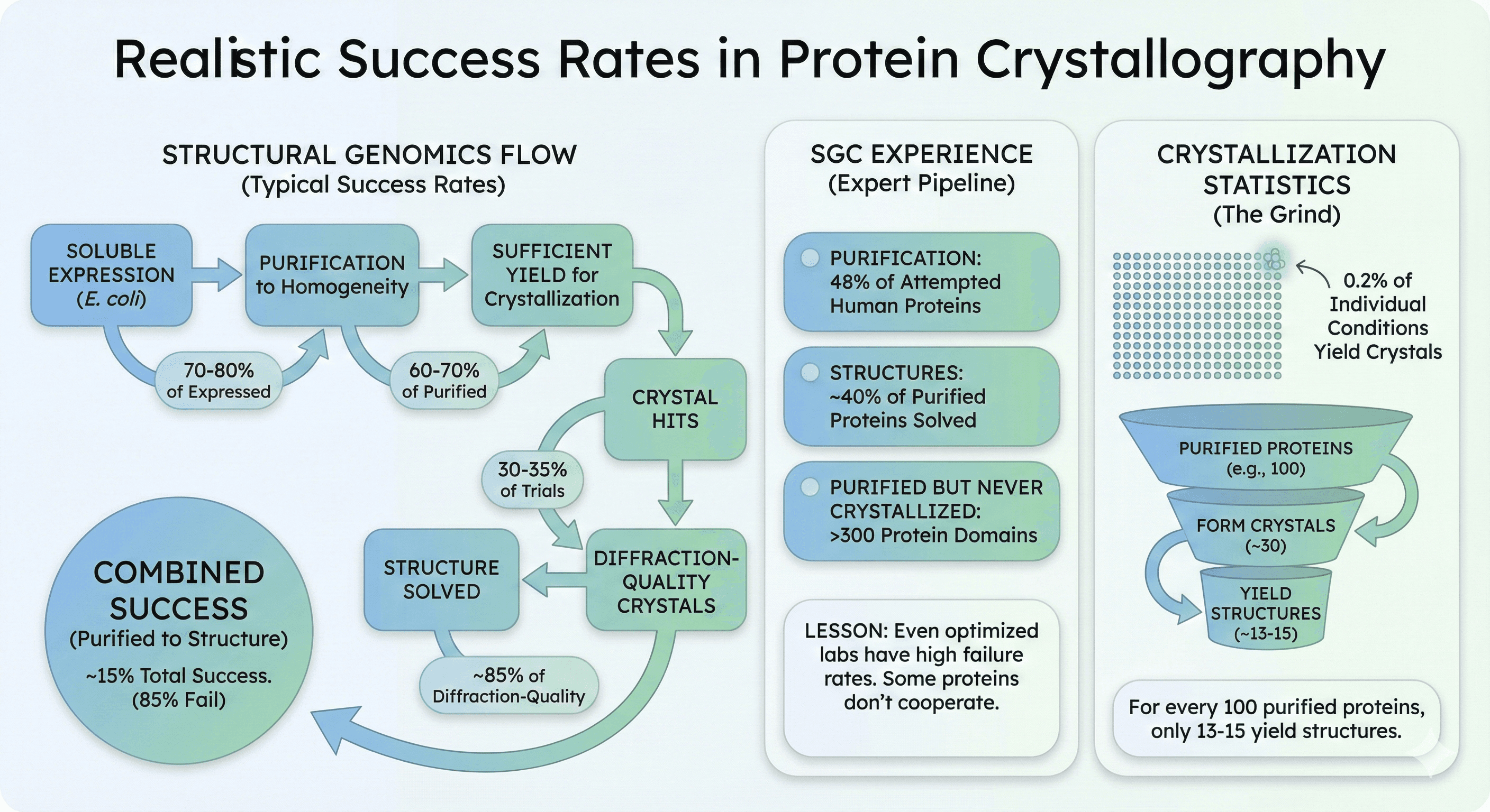 Combined: From purified protein to structure, approximately 15% succeed. That means 85% of proteins that reach crystallization trials never yield a structure.