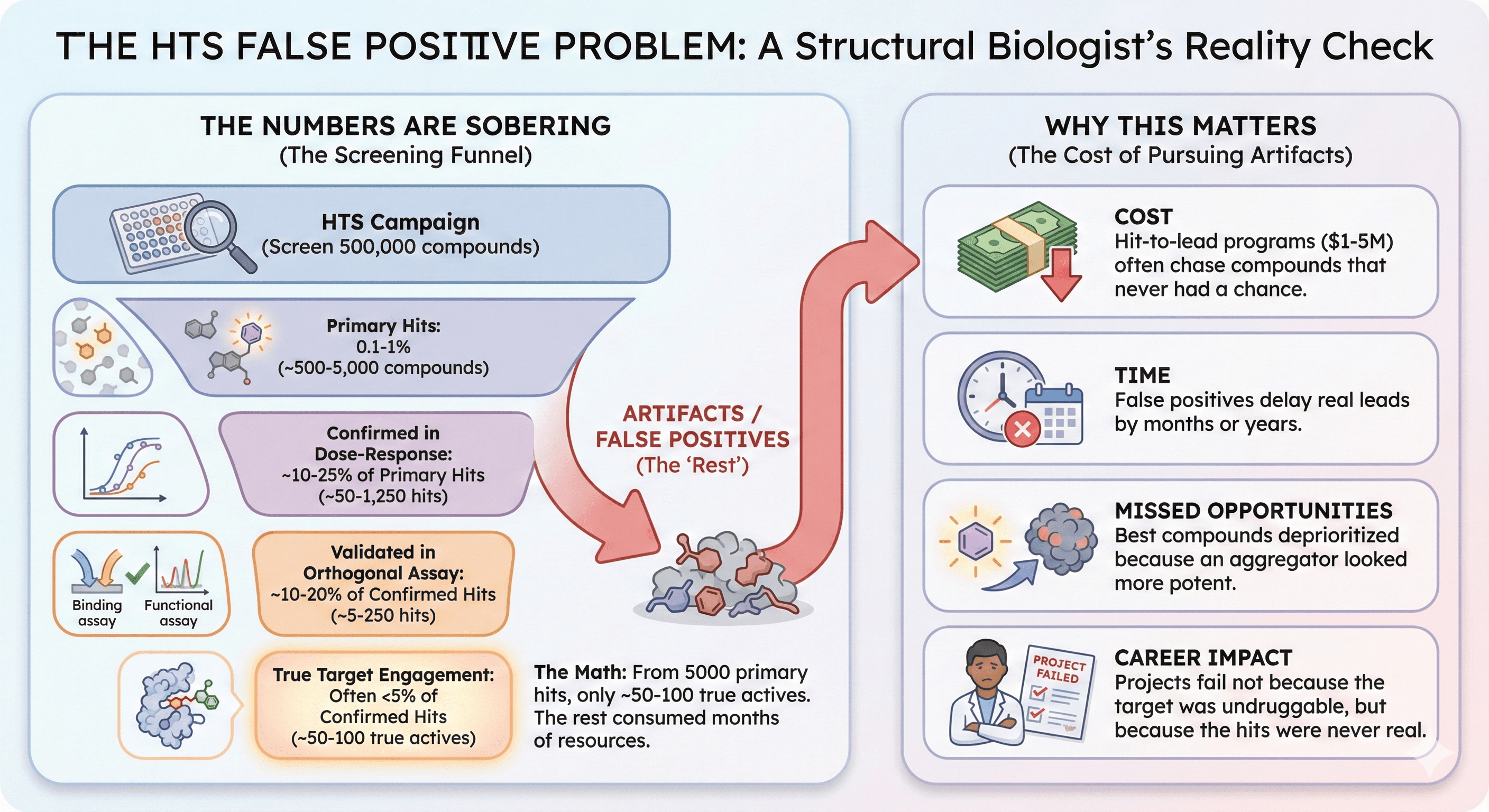 The math: From 5000 primary hits, you might get 50-100 true actives. The rest consumed months of chemistry resources pursuing artifacts.