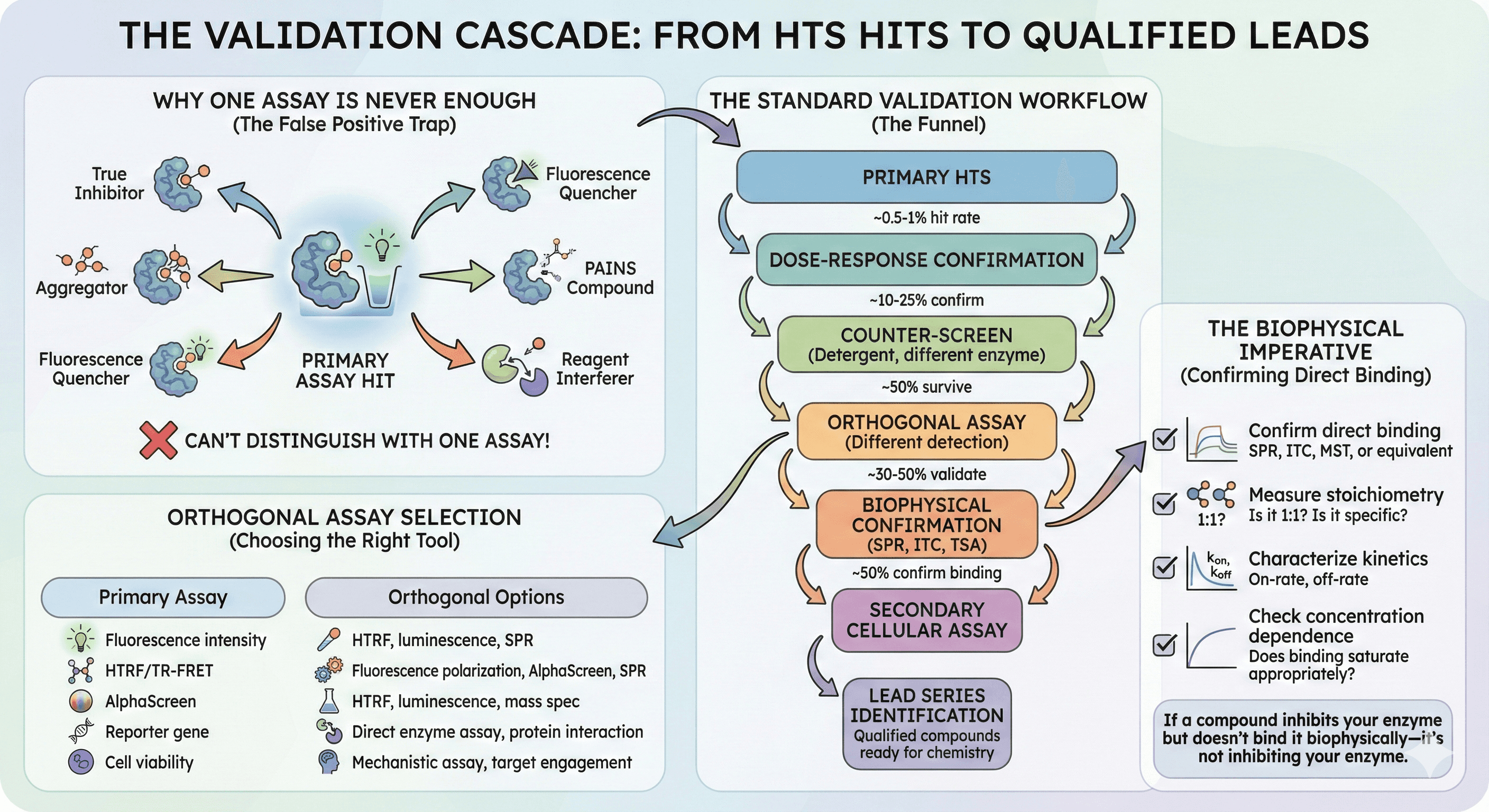 The key insight: A hit is not a hit until it's validated by orthogonal methods. Primary screening identifies candidates for investigation—not compounds ready for optimization.