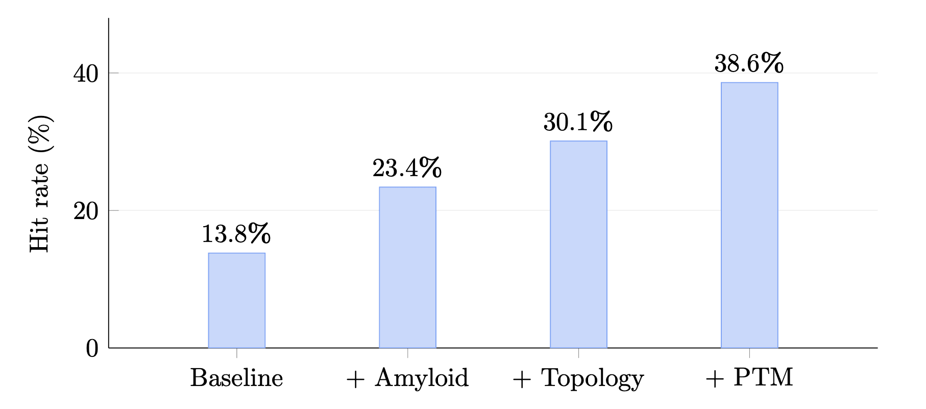 Starting from a controlled subset, adding biology-informed filters increased the enrichment hit rate from 13.8% to 38.6%, which is a 2.8× lift. The exact stack was specific to that benchmark and was selected retrospectively, so it should not be treated as a production-ready rule set. But it shows that these features can have practical screening value when layered on top of existing heuristics.