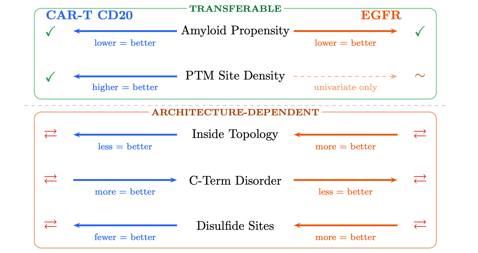 The clearest example was lower aggregation propensity. Across both the CAR-T and EGFR datasets, lower amyloid / aggregation-related signal was associated with better outcomes. In other words, this appears to be one of the more robust things worth screening for before synthesis and testing.