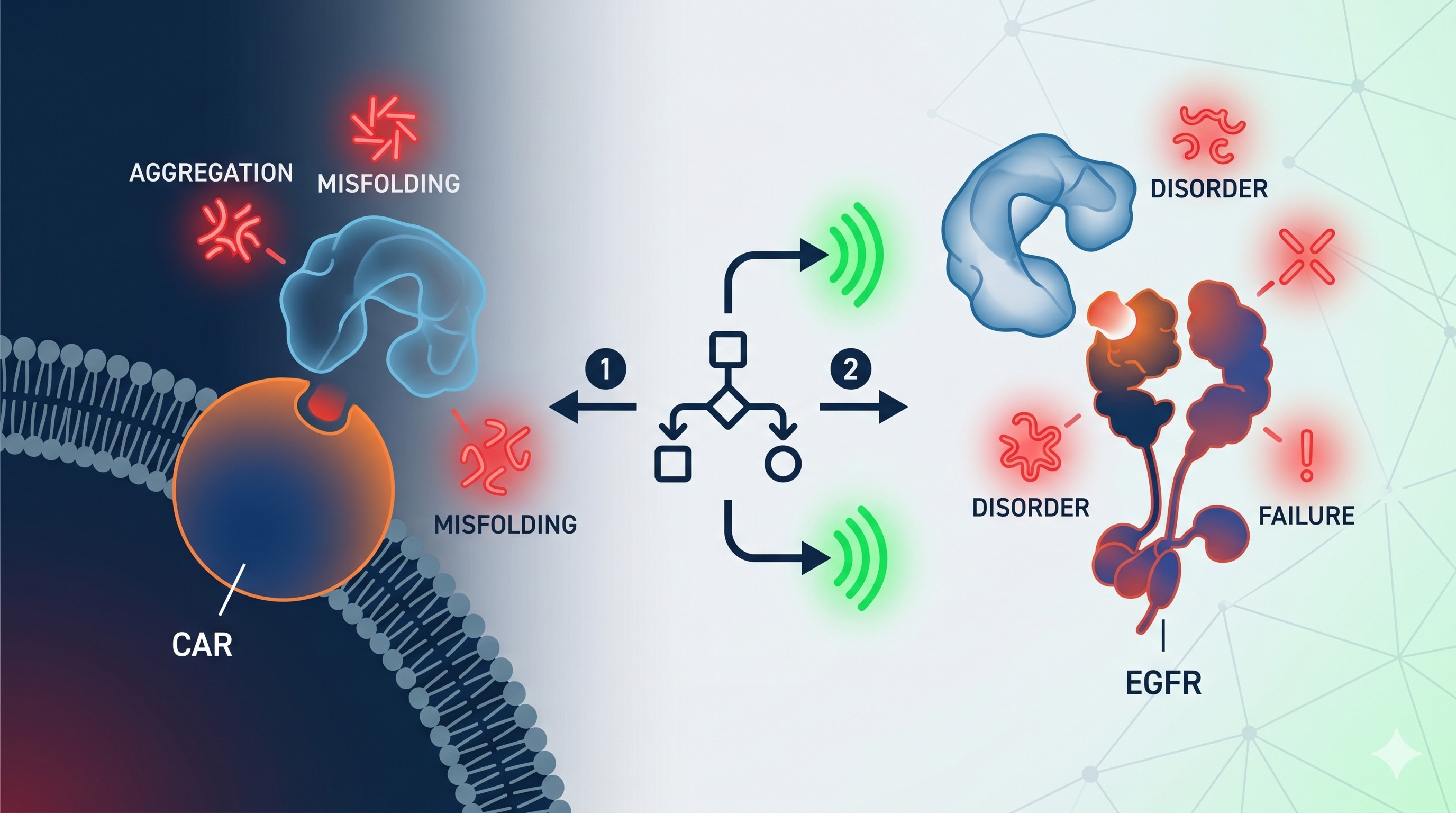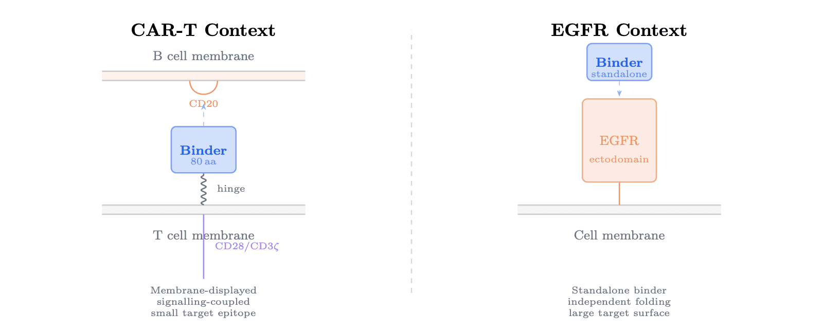 In the CAR-T benchmark, the binder is part of a membrane-displayed receptor system. Some degree of flexibility or extracellular compatibility may be helpful. In the EGFR benchmark, the binder is a standalone folded unit. There, lower disorder and more compact fold-related character were much more favorable.