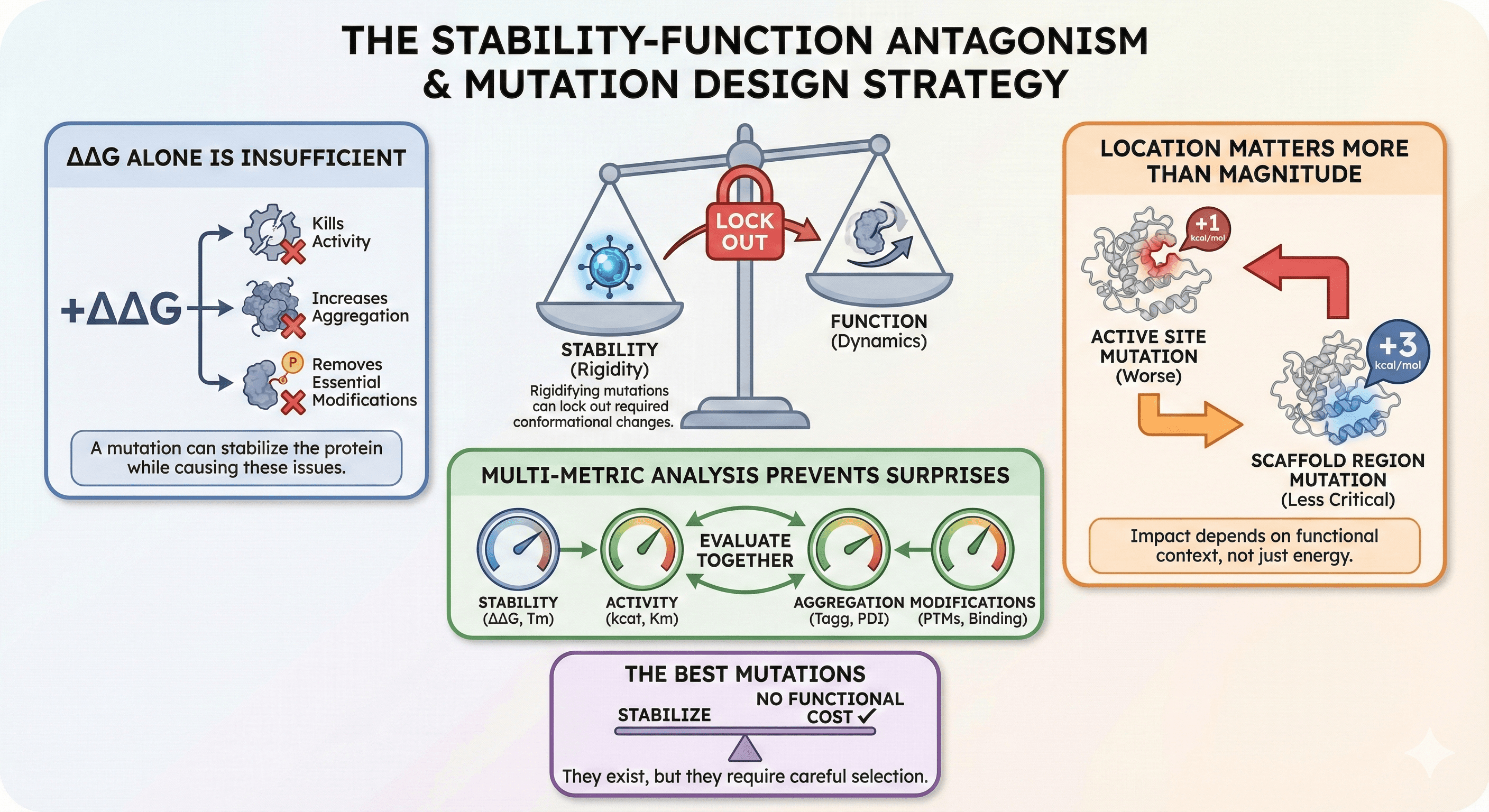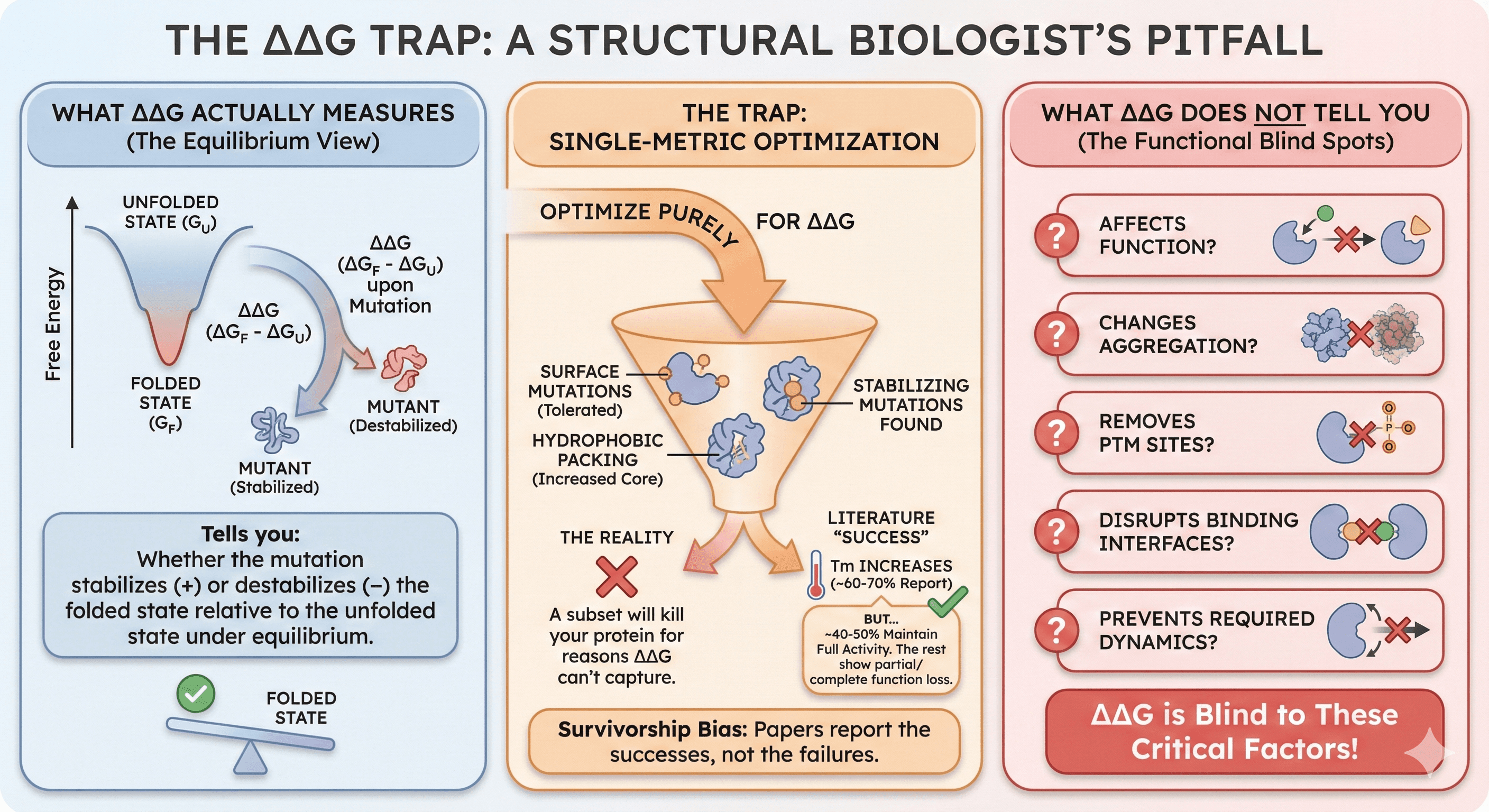 ΔΔG alone is insufficient: A mutation can stabilize the protein while killing activity, increasing aggregation, or removing essential modifications