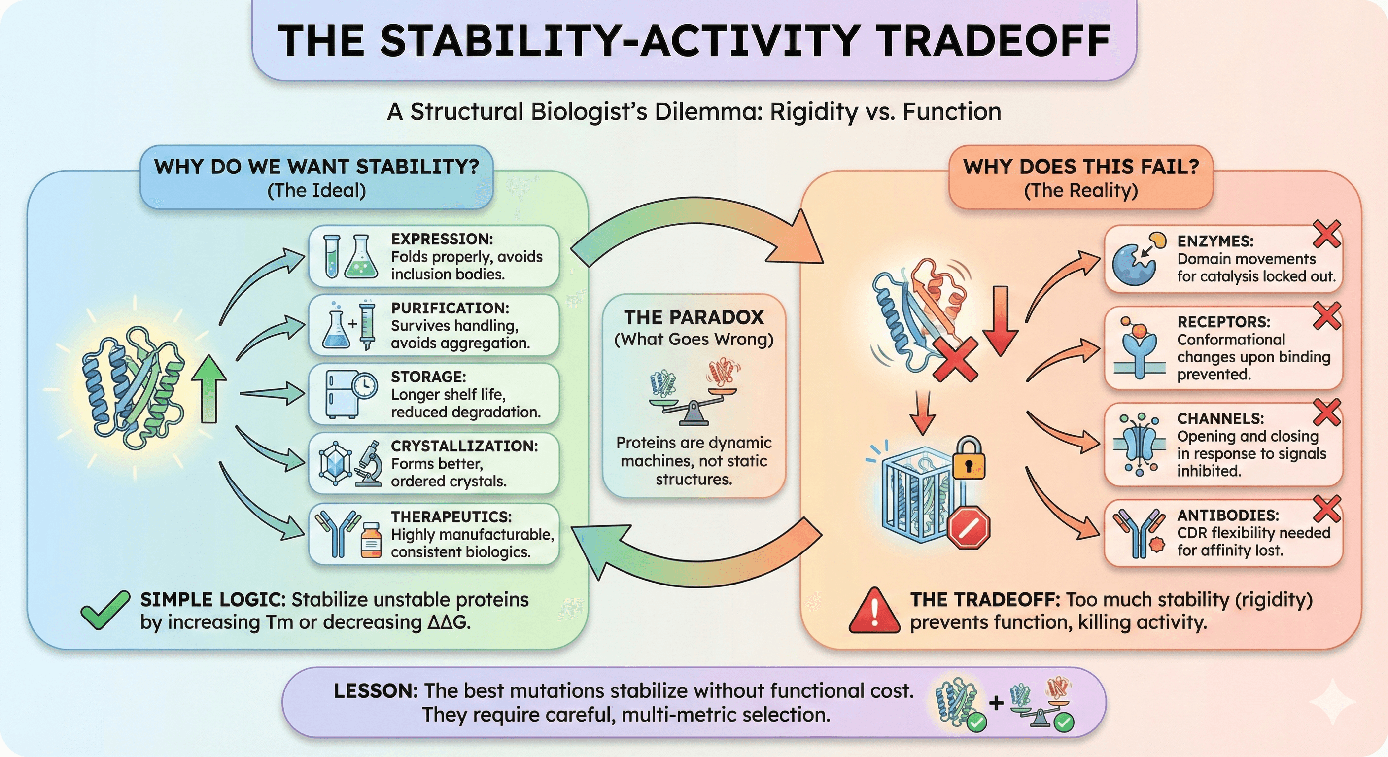 The goal is to find stabilizing mutations that preserve function—not to blindly maximize stability and hope nothing breaks.