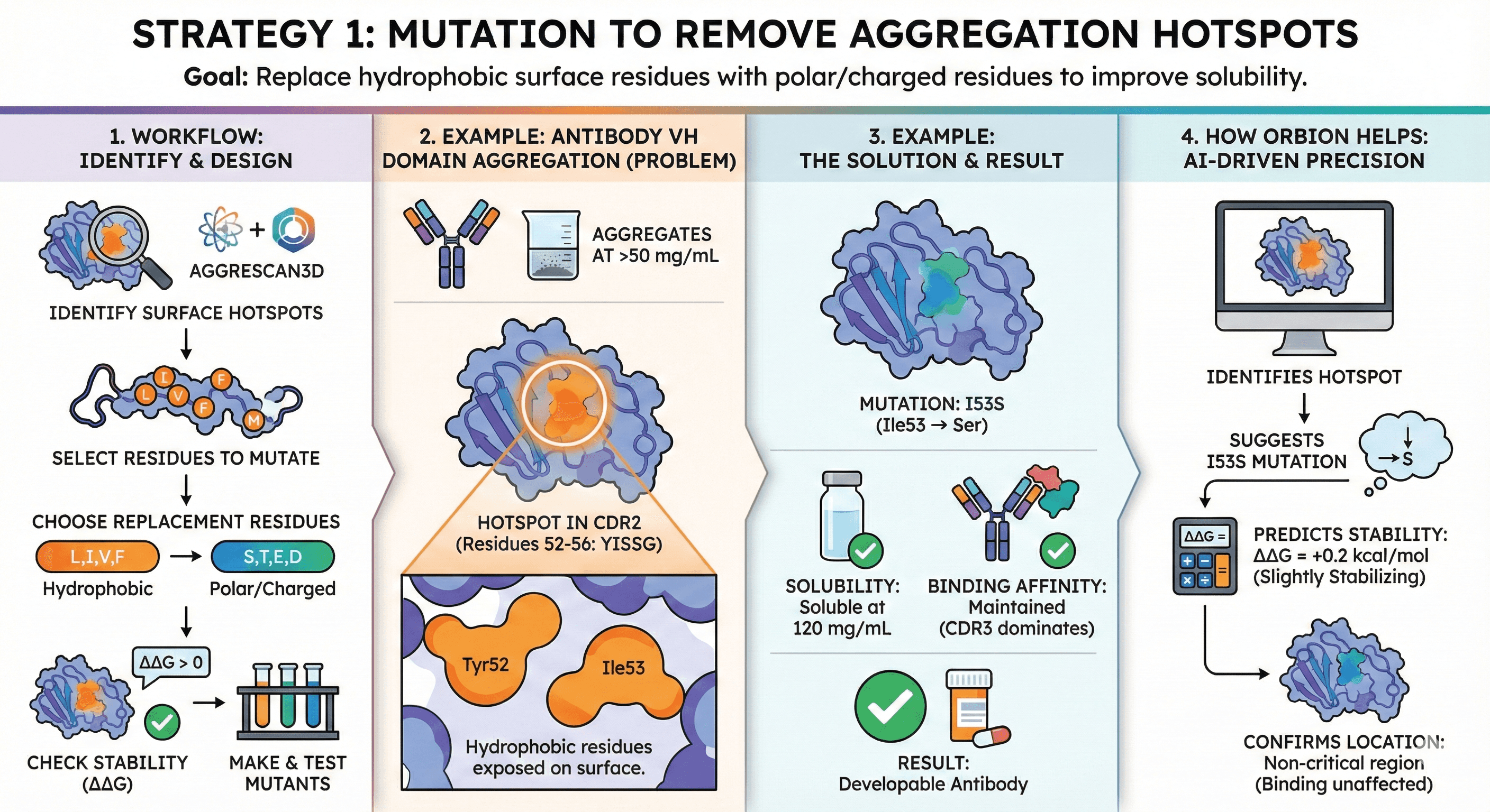 Solution: Computational prediction of aggregation hotspots + rational mutagenesis increases success rates 2-5×