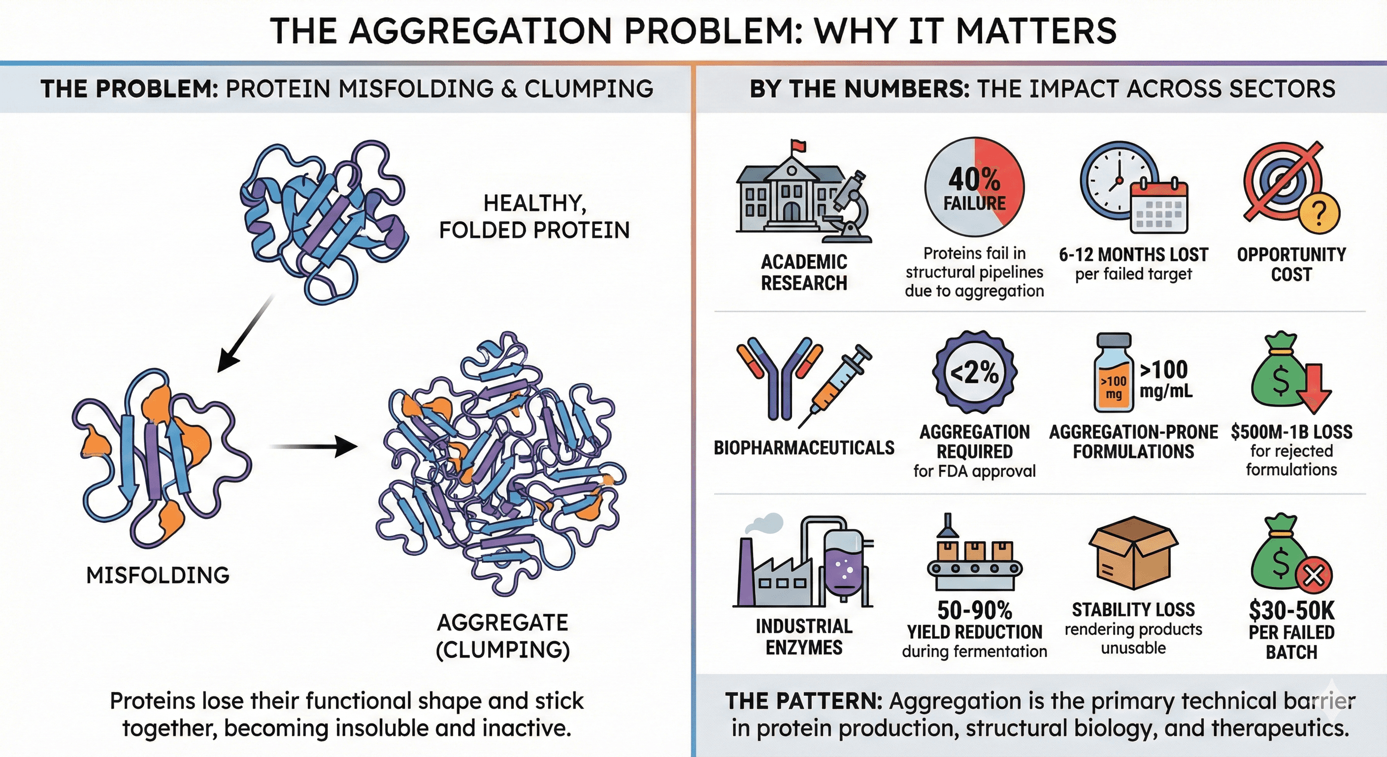 The pattern: Aggregation isn't a niche problem. It's the primary technical barrier in protein production, structural biology, and therapeutics.