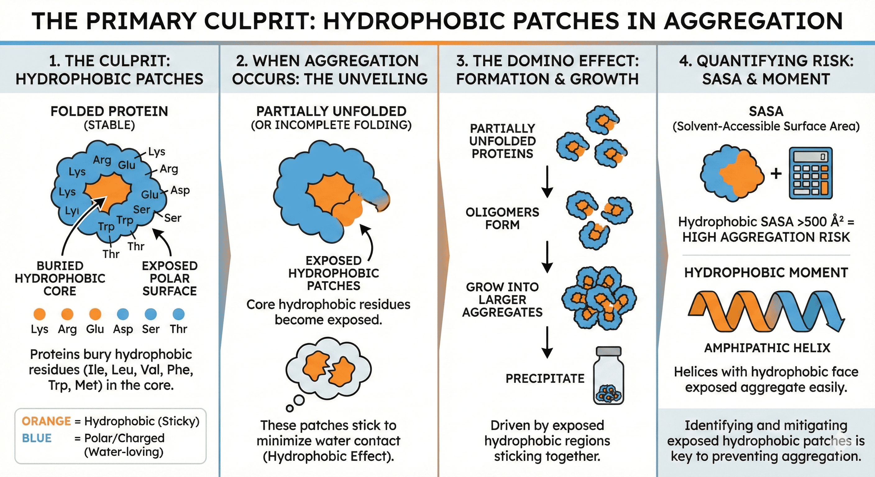 Main culprits: Exposed hydrophobic patches, partial unfolding, concentration-dependent oligomerization