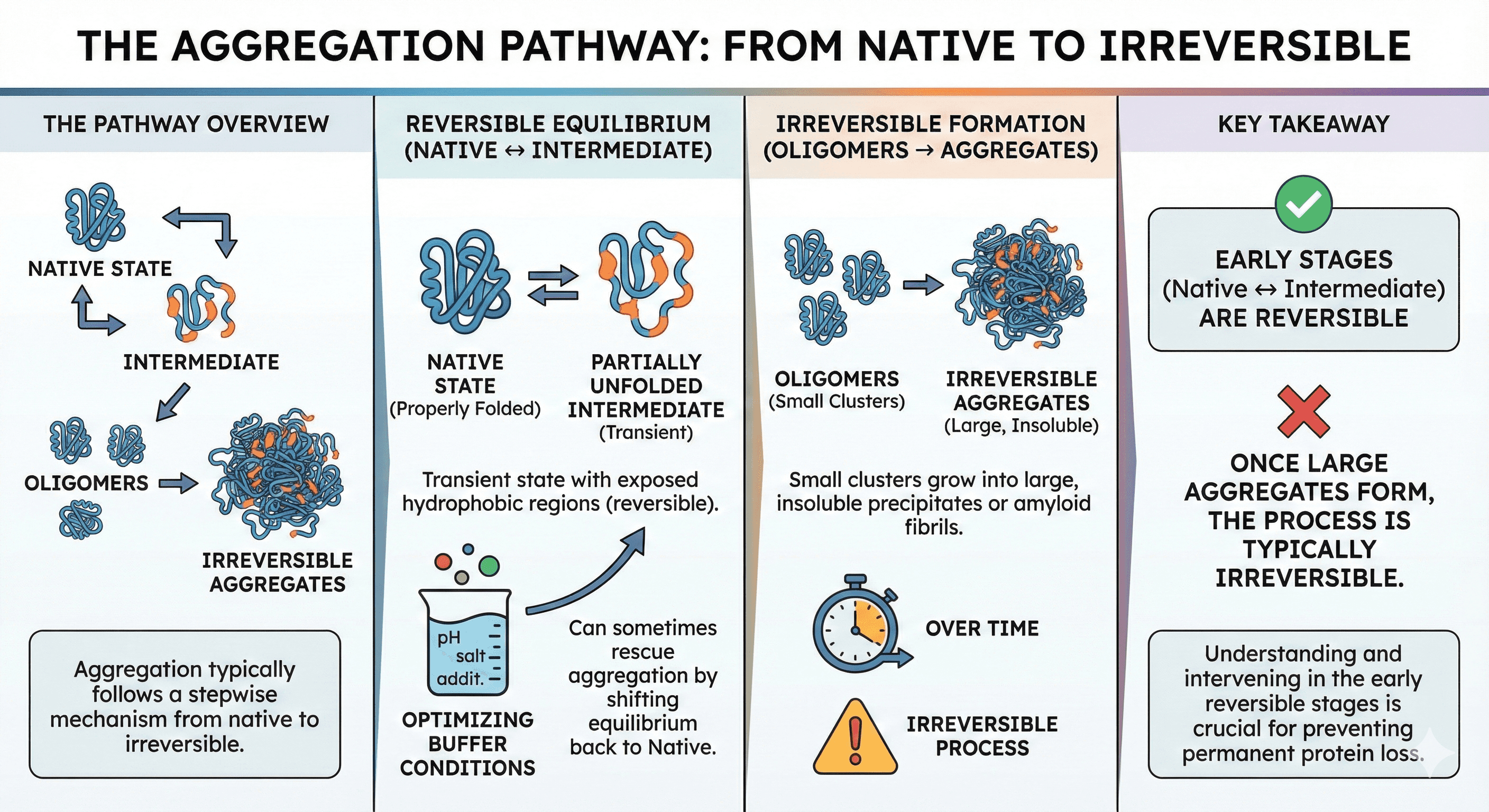 When it happens: During purification, storage, or any stress condition (heat, pH shift, detergent removal)