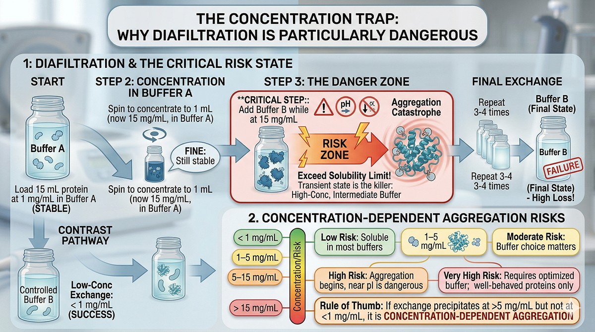 The danger: At step 2, your protein is at 15 mg/mL in Buffer A. That's fine—it was stable in Buffer A. But at step 3, you've added Buffer B while the protein is at 15 mg/mL. If the protein is less soluble in Buffer B, you just exceeded its solubility limit at 15 mg/mL before you've done enough rounds to actually reach Buffer B conditions.