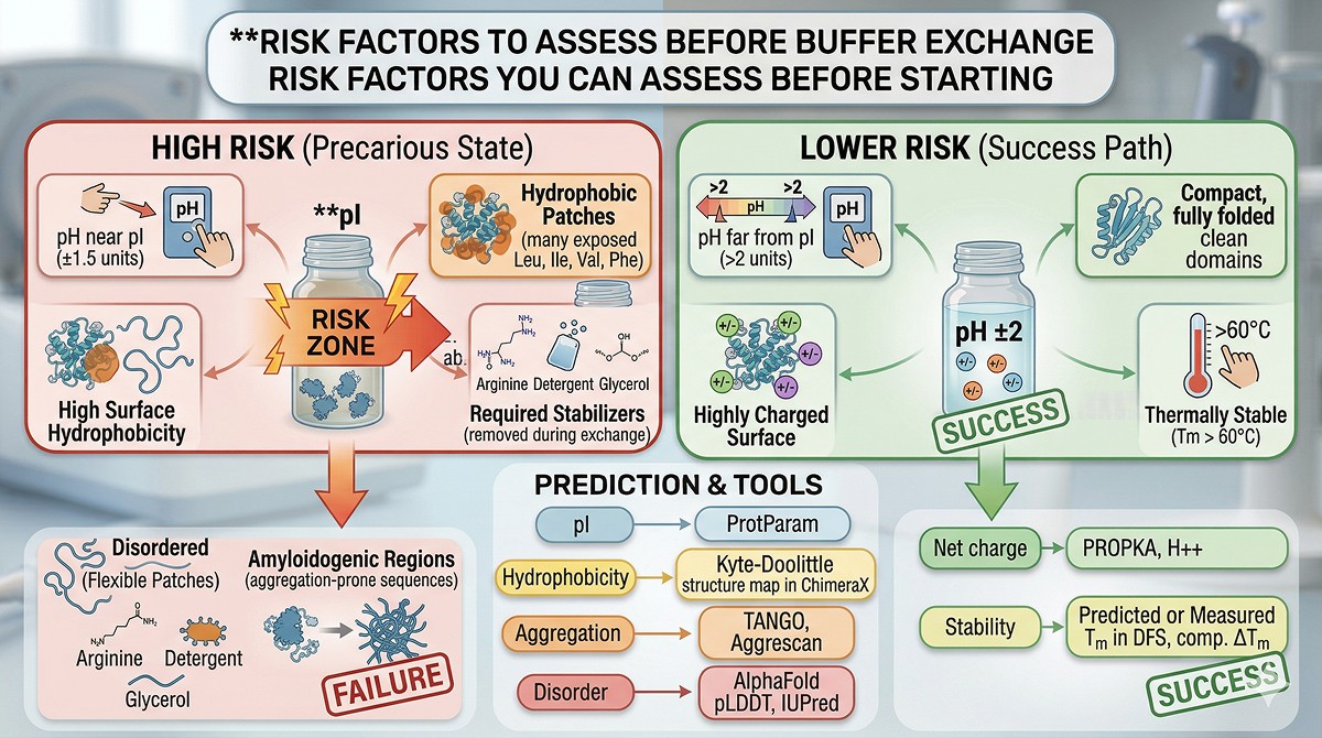 If your protein has high predicted aggregation propensity, include aggregation suppressors (arginine, glycerol, low-concentration detergent) in your target buffer.