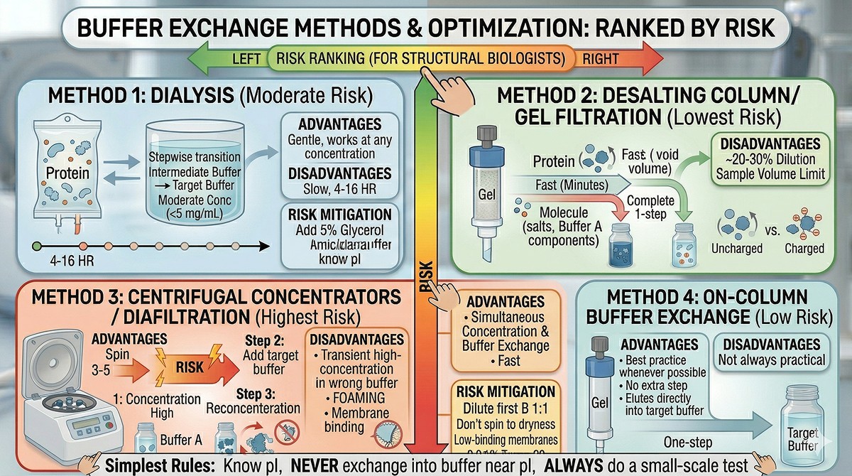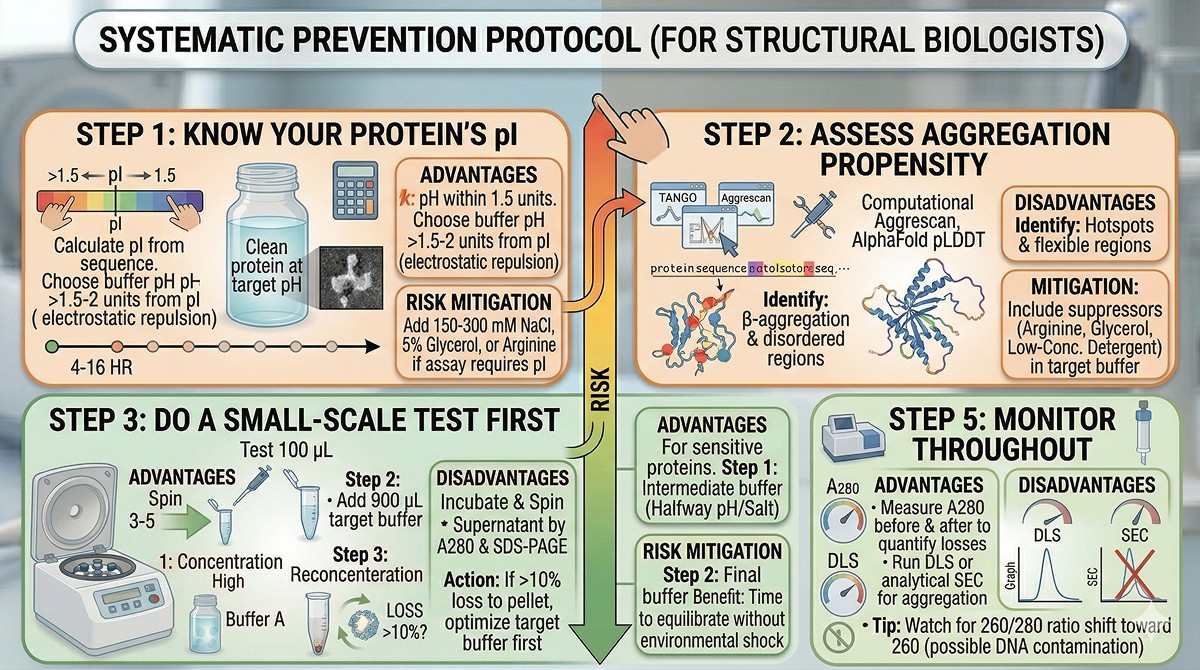The simplest rule: know your protein's pI, never exchange into a buffer near it, and always do a small-scale test first. These three habits prevent 90% of buffer exchange disasters.