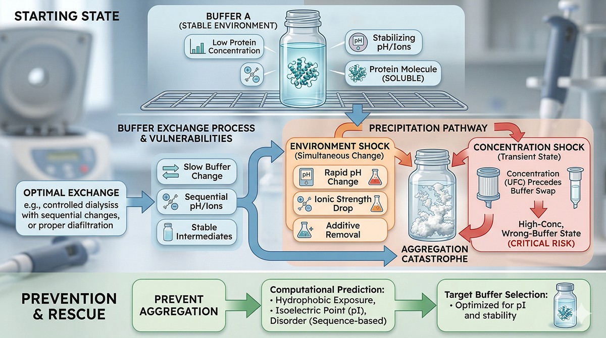 Buffer exchange precipitation is a concentration + environment problem, not a protein quality problem—the protein was fine until you changed its conditions