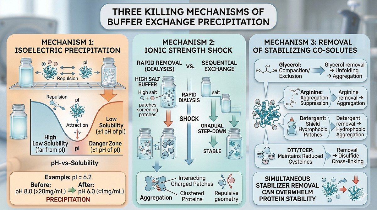 Buffer exchange disrupts this balance. When you change pH, ionic strength, or remove stabilizers, you shift the equilibrium—sometimes past the solubility limit.