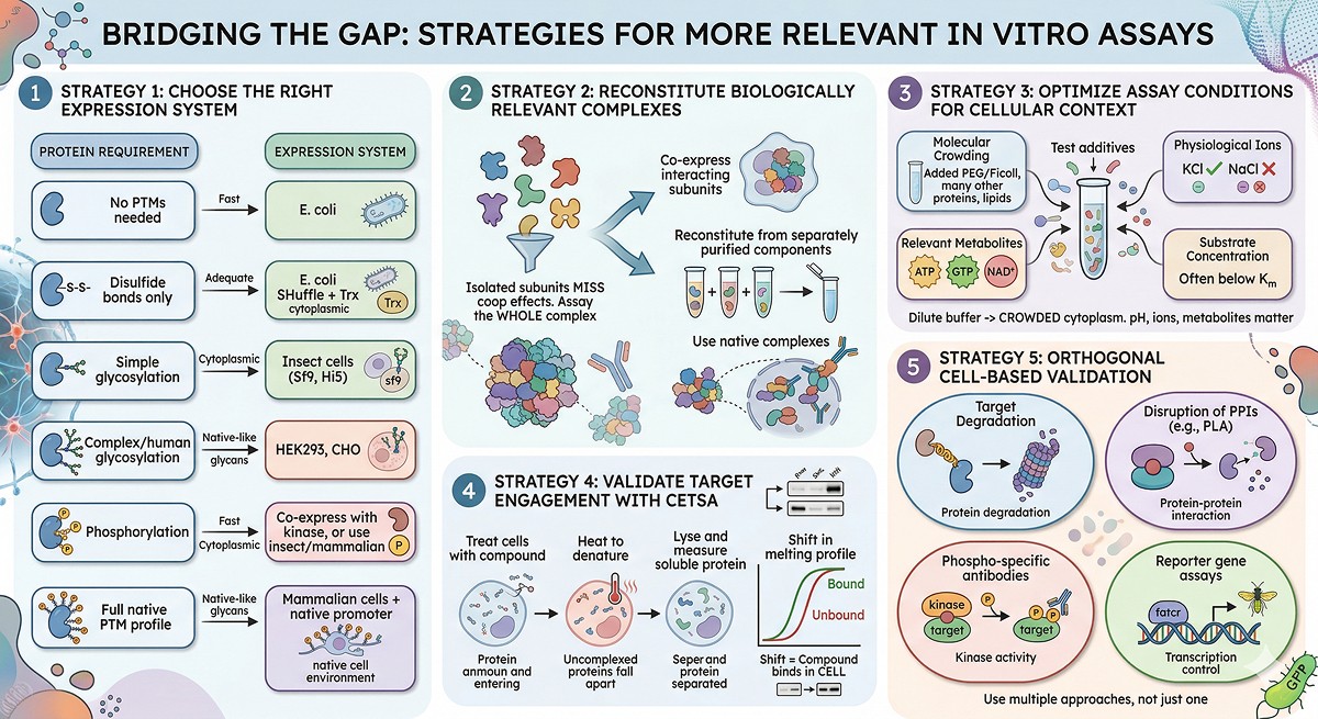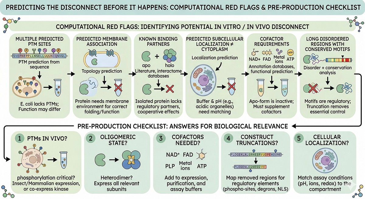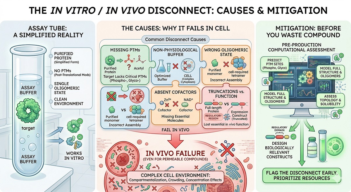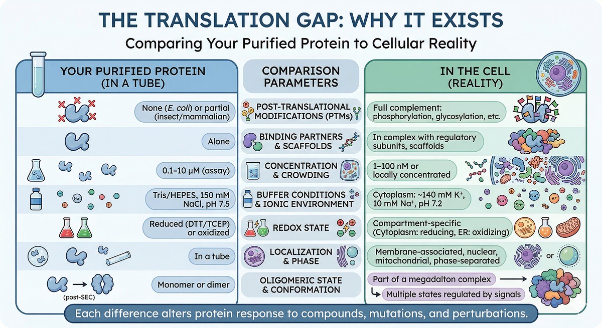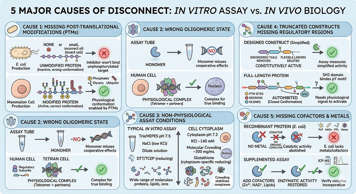 The most common causes of in vitro/in vivo disconnect: missing PTMs, wrong oligomeric state, absent cofactors, non-physiological buffer conditions, and missing protein-protein interactions