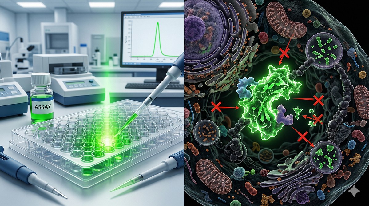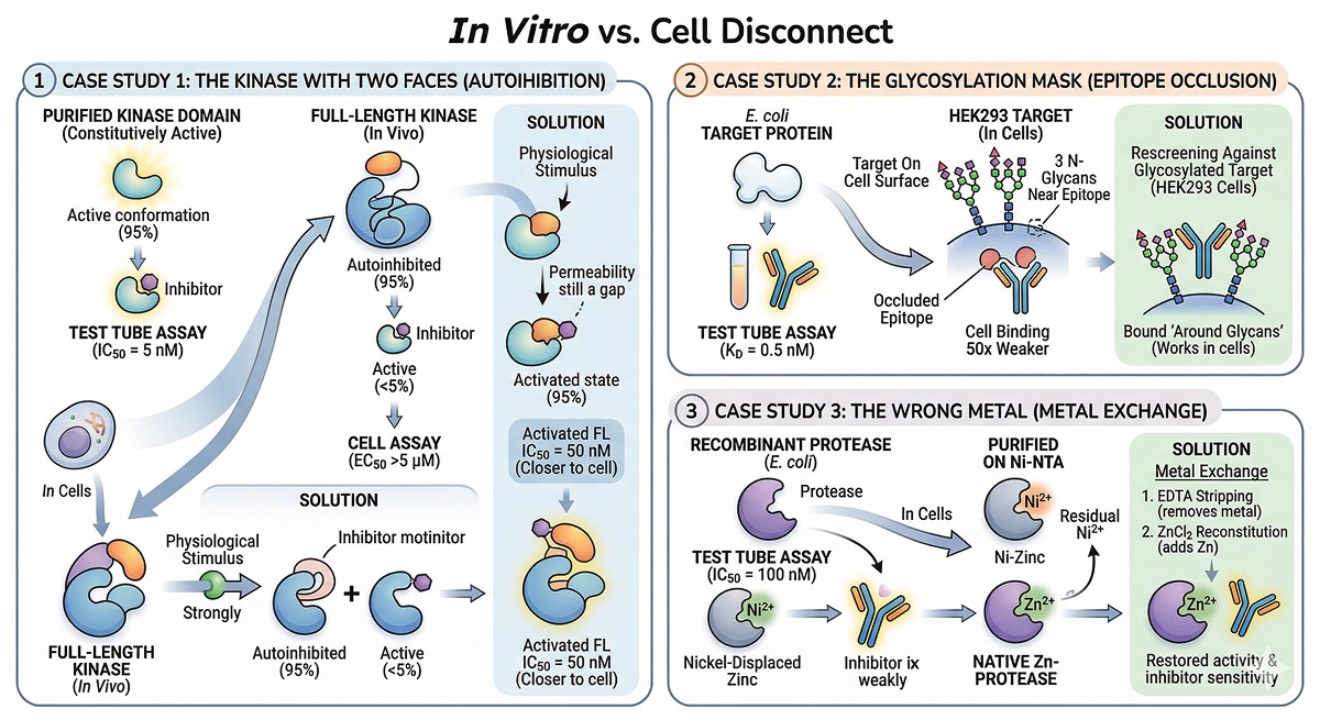 Your enzyme inhibitor has an IC50 of 12 nM in the biochemical assay. Clean dose-response. Competitive mechanism confirmed. You move to cells, expecting a potent hit. The EC50 in the cell-based assay? Greater than 10 µM. An 800-fold drop in potency. Your medicinal chemistry team is skeptical. Your biologist says "the compound doesn't work." But the compound works perfectly—against a purified, recombinant, truncated protein in an optimized buffer that looks nothing like the inside of a cell.